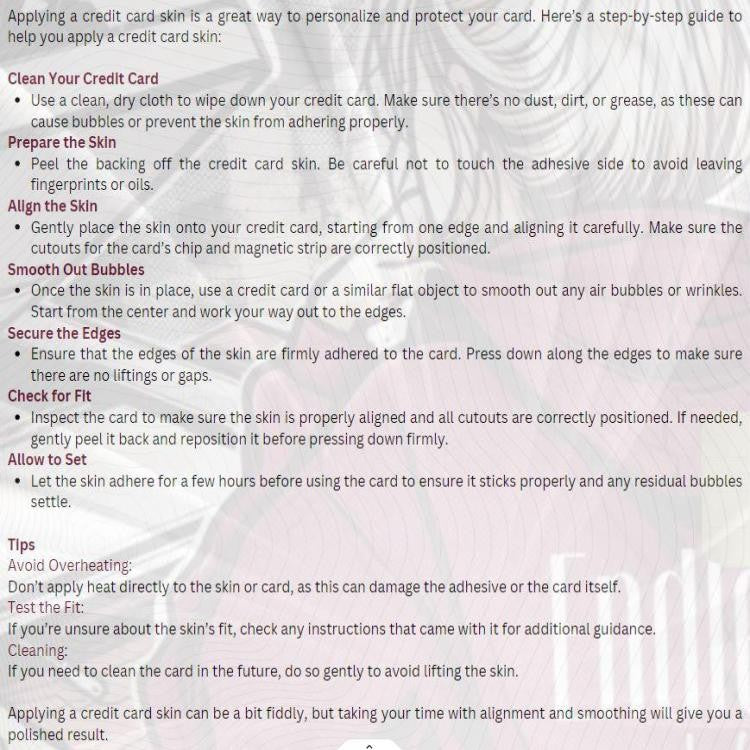 Our skins are crafted from durable materials to keep your anime art vibrant. The application is easy, ensuring a secure fit. All card functions remain fully accessible. The waterproof feature makes it perfect for customizing your credit or debit card.
