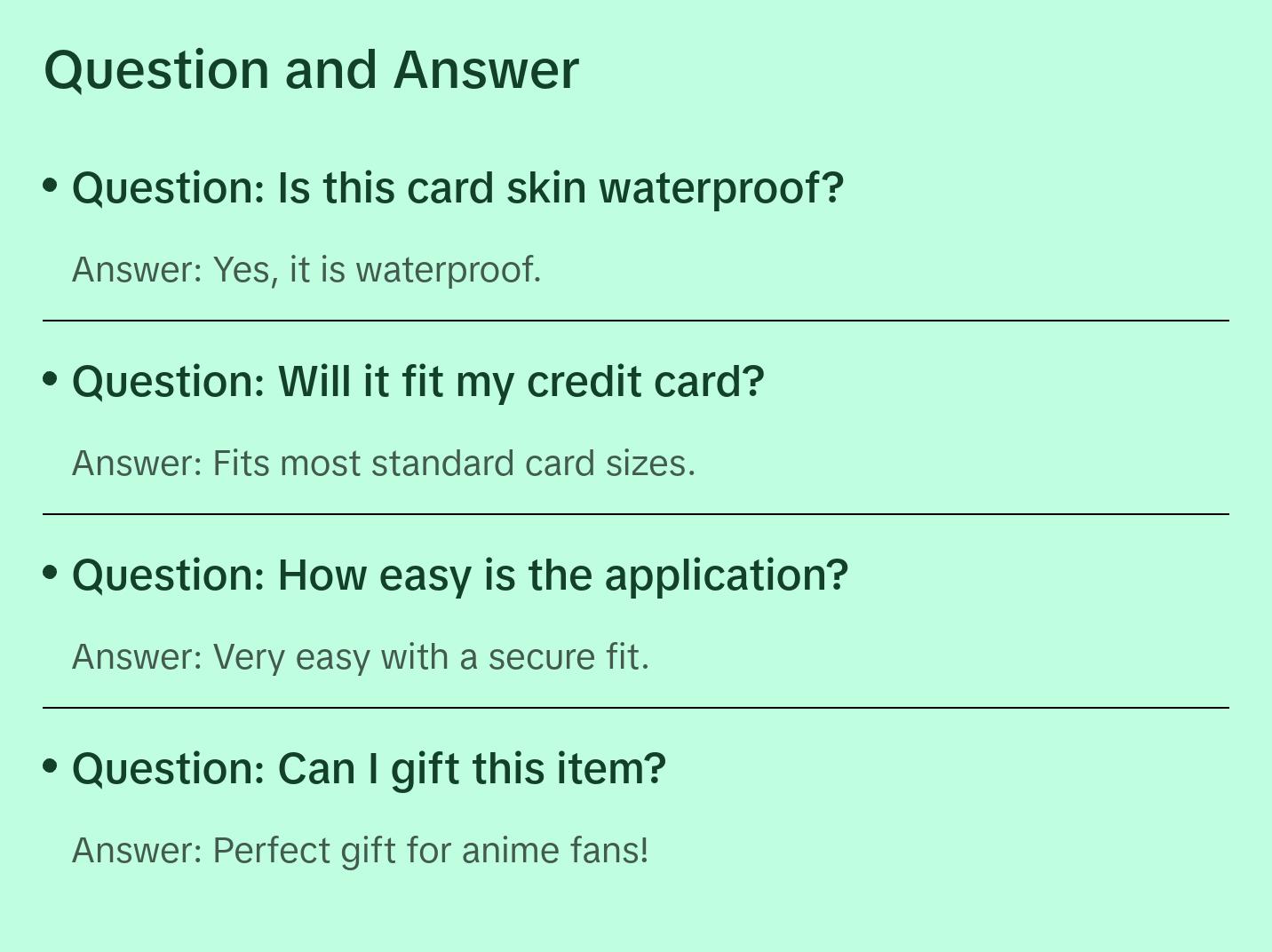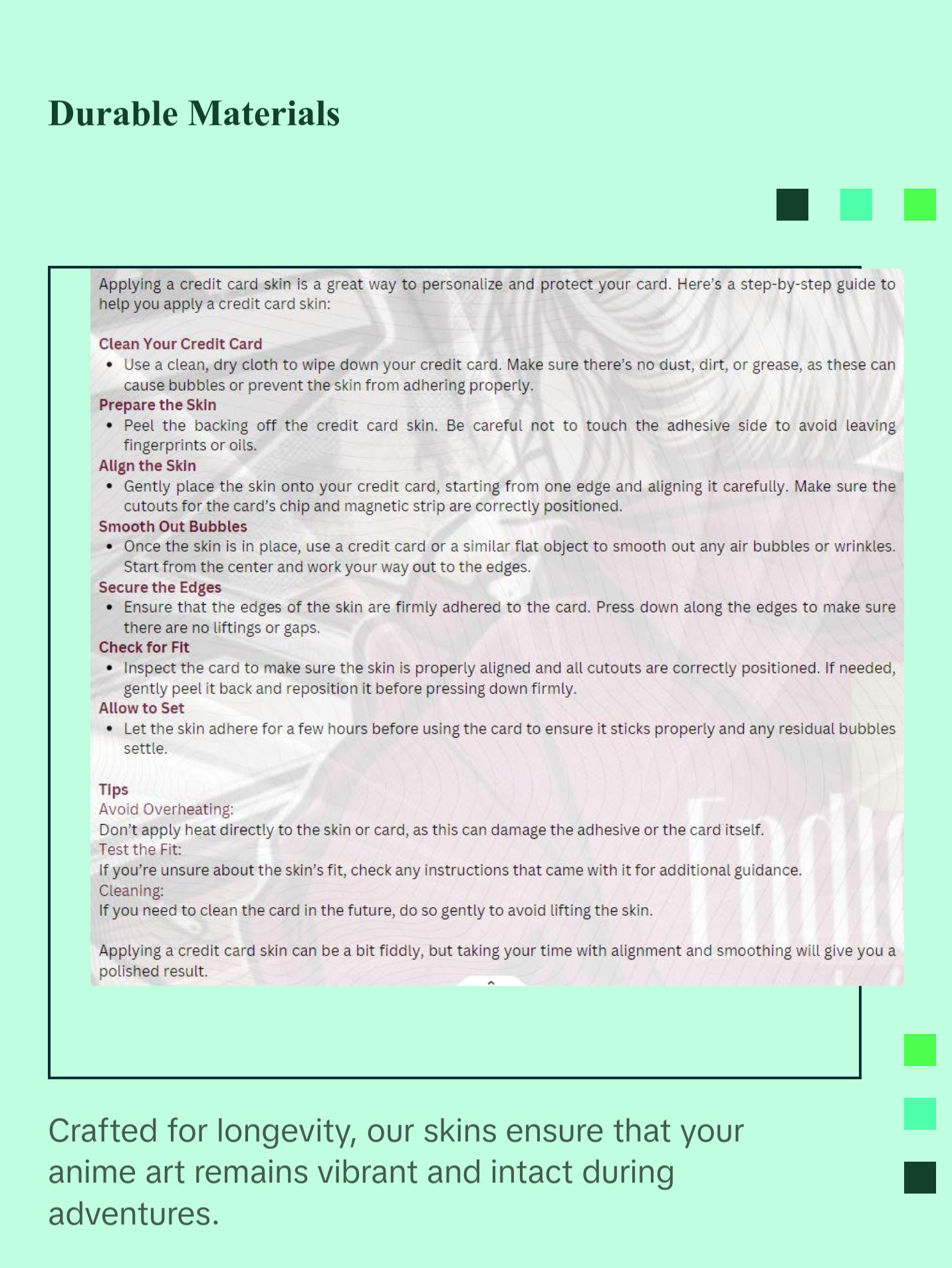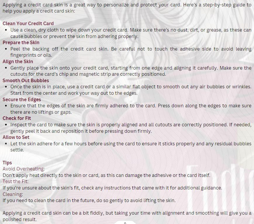 Built to endure! Our skins are crafted from durable materials to keep your favorite anime art vibrant. No matter where your adventures take you, your card stays protected. The stickers are waterproof, making them perfect for customizing your credit or debit card. Enjoy a secure fit with full access to all card functions.