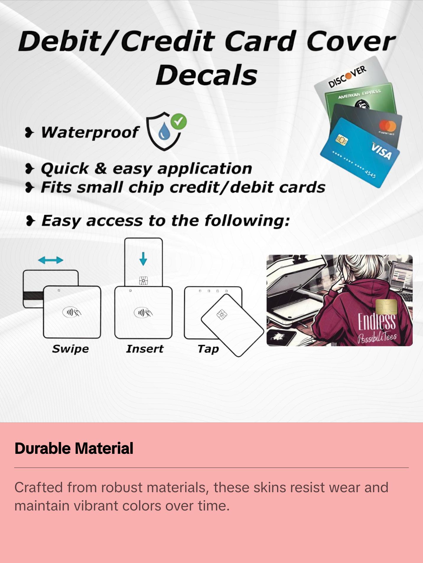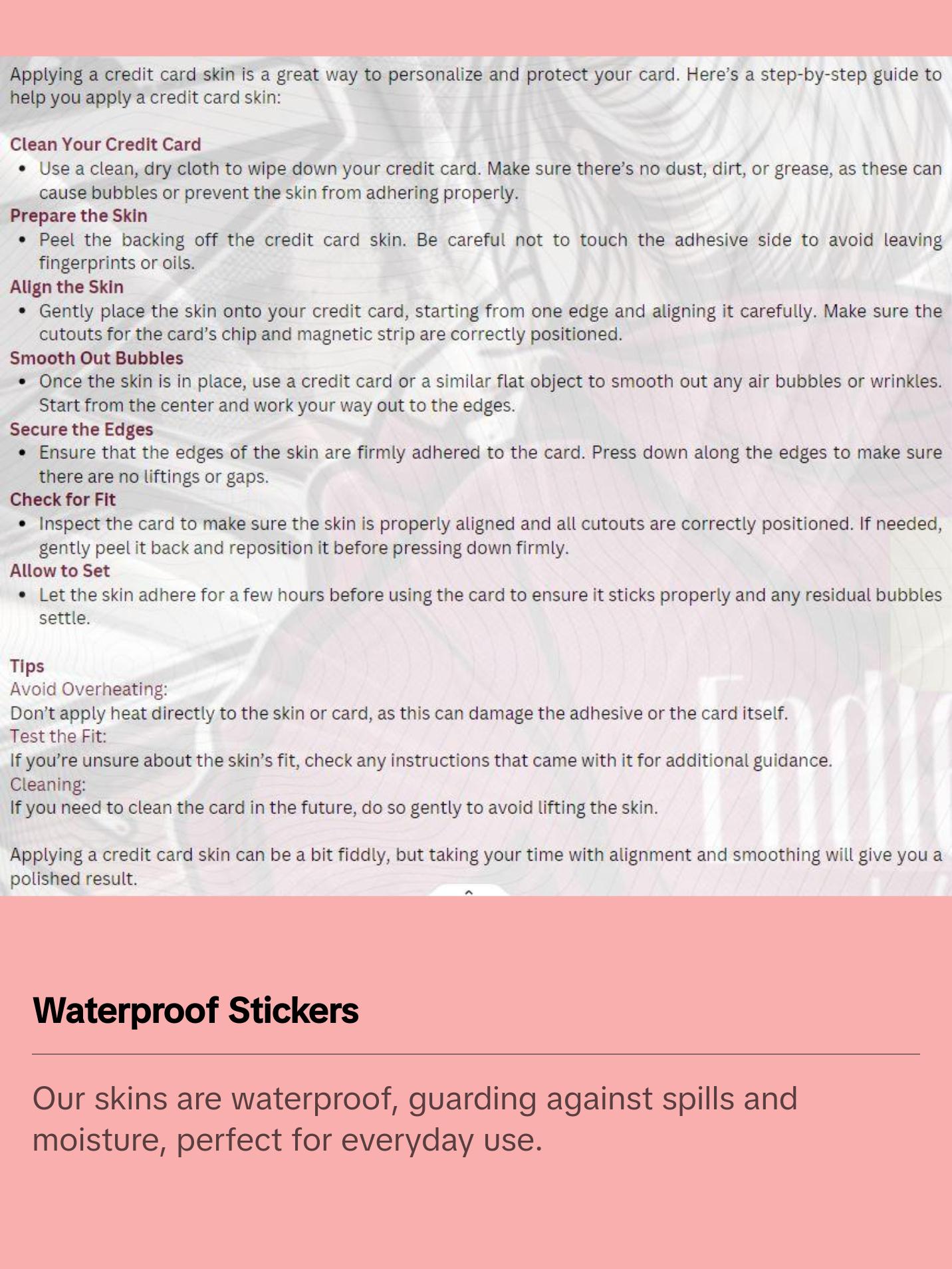 Our stickers are waterproof, making them perfect for customizing your credit or debit card. We also offer sticker cover options: Holographic Clear For any questions or concerns regarding an item or order, please reach out to us, and we'll do our best to assist you promptly. We appreciate your patience and support!
